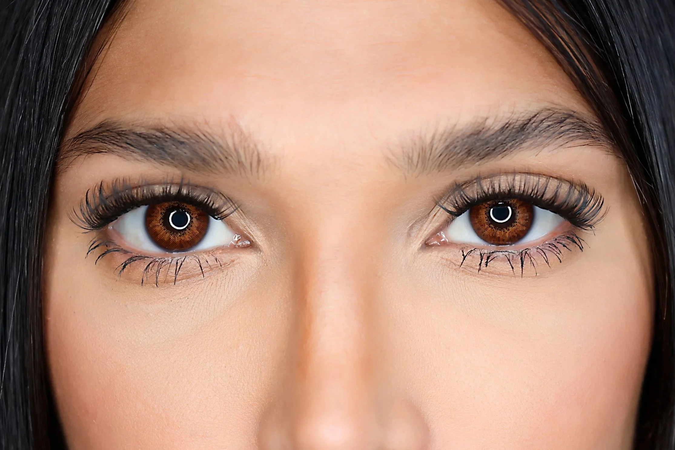 Close-up of a person applying makeup or adjusting their eye with a black tool, focusing on the brown eye and eyelashes.